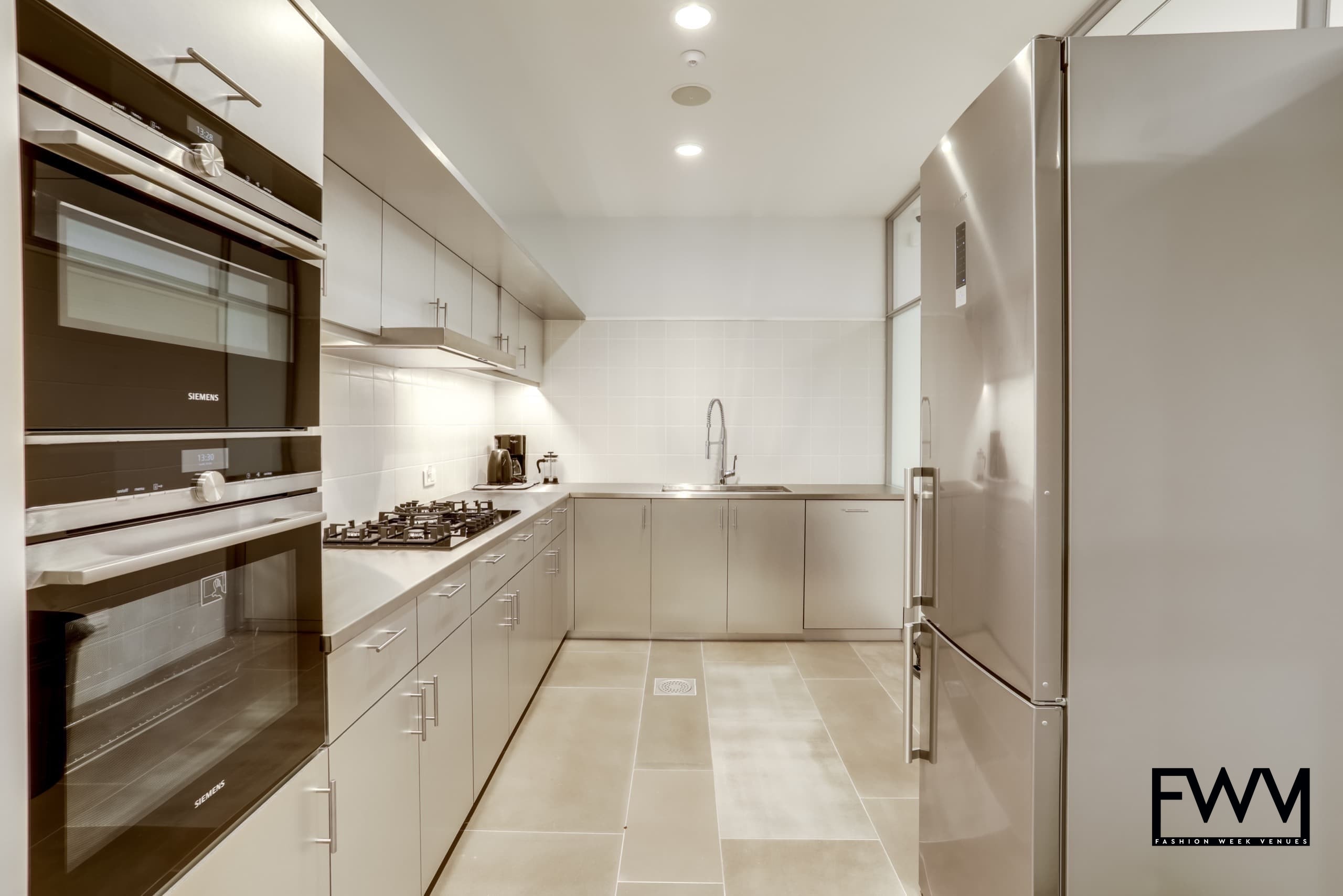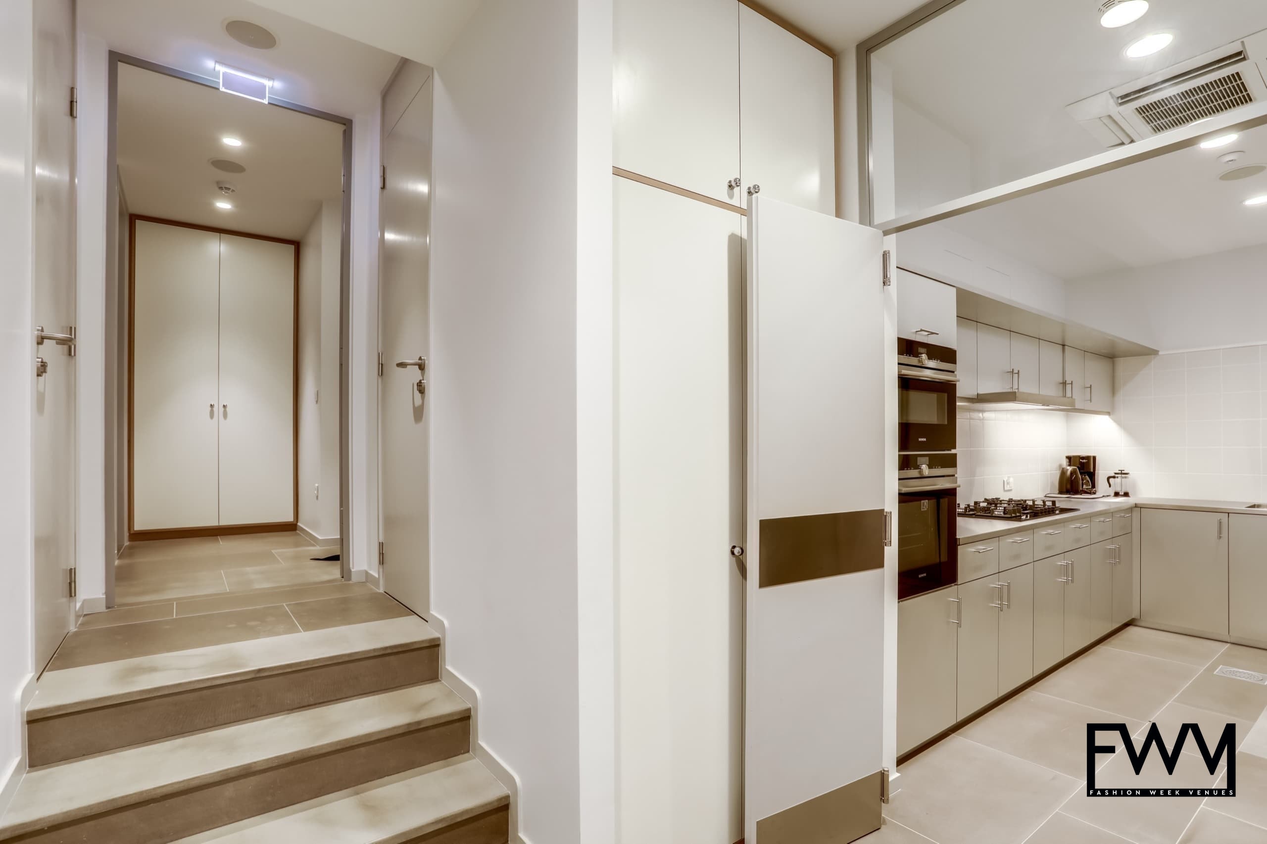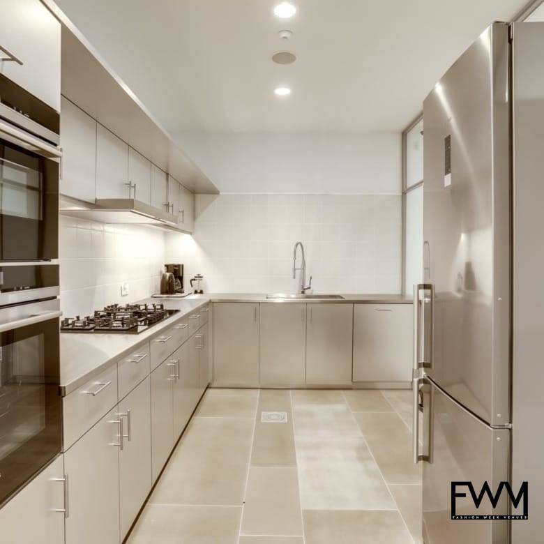 The modern interiors feature white walls, concrete floors, and expansive windows that flood the space with natural light. Its modular layout and high-end decor provide a versatile setting for fashion retail, product launches, or exclusive events. The space includes practical amenities like a stock room and a kitchen, ensuring seamless event execution.