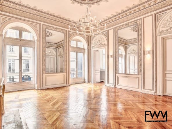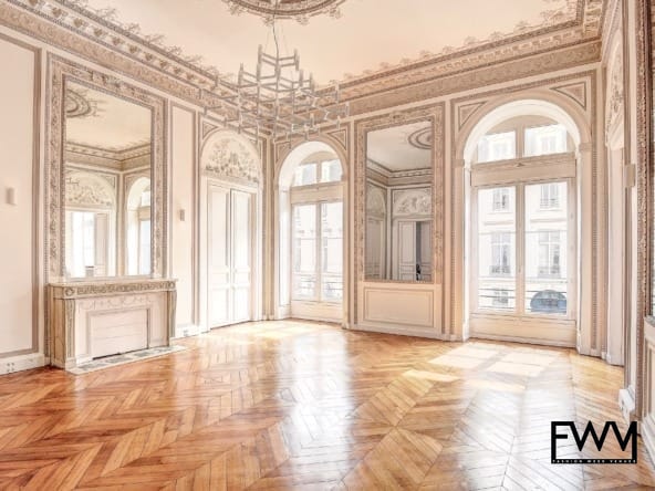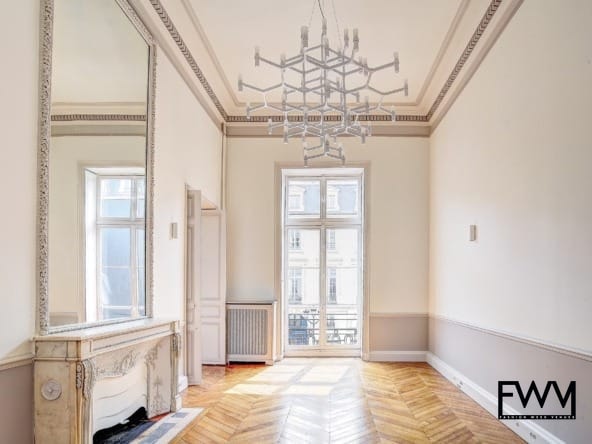 With its stunning grey and white tones, parquet floors, ornate fireplaces, and superbly molded walls, the space exudes timeless charm. The 5-meter-high ceilings and large windows fill the interior with natural light, creating a bright and inviting atmosphere that complements its historical elegance.