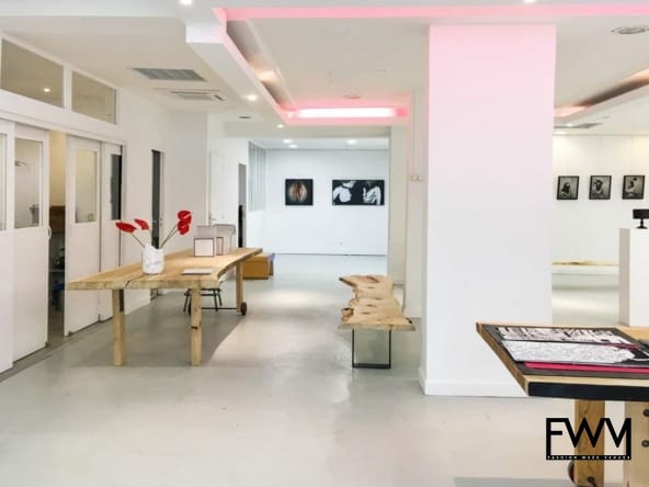 The interior features sleek white walls and polished concrete floors, creating a fresh and contemporary atmosphere ideal for exhibitions, private sales, or unique events. Its elegant ambiance is complemented by essential amenities, including air conditioning, heating, internet connectivity, and a security system, ensuring a comfortable and secure environment for your guests and clients.