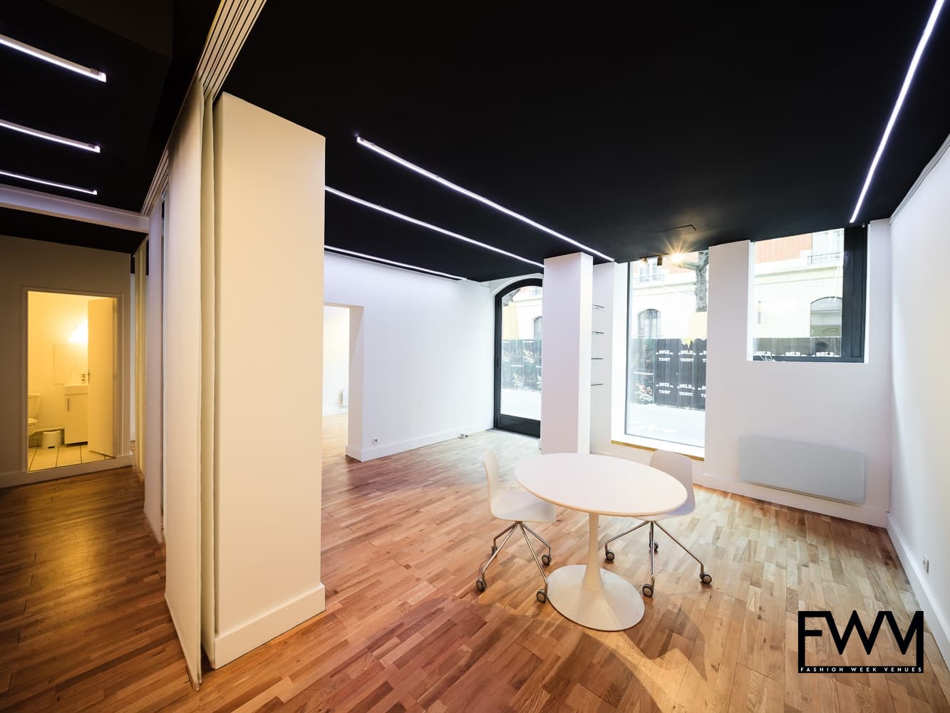 The showroom offers a spacious 50 m² layout with an open-plan design flooded with natural light. Its outstanding oak flooring combined with white walls and a sophisticated black ceiling creates an atmosphere of creativity and elegance. The programmable neon lighting system enhances the ambiance, allowing you to customize the lighting to suit your event’s theme or mood. You will benefit from three large windows, providing excellent visibility and a welcoming vibe.