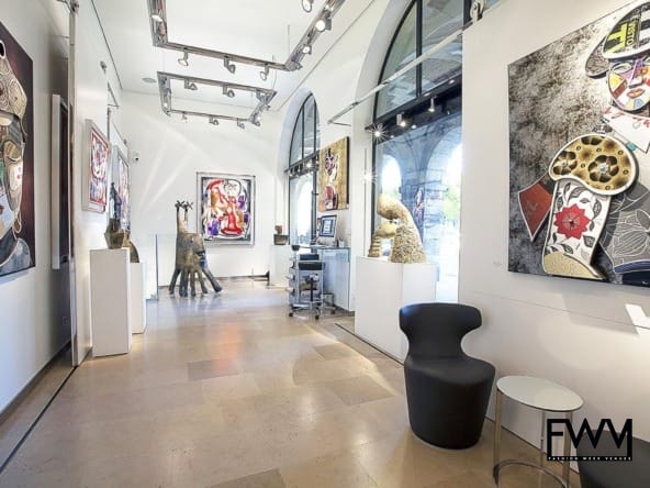 The gallery spans an impressive 45 square meters on the ground floor, featuring two large arched windows that fill the space with natural light and charm. The spectacular high ceilings and bright tiles contribute to an open and inviting atmosphere, making it an ideal setting for showcasing your designs or artistic expressions. Whether you’re hosting an exclusive event or an art launch, the versatile layout allows for seamless adaptation to your needs.
