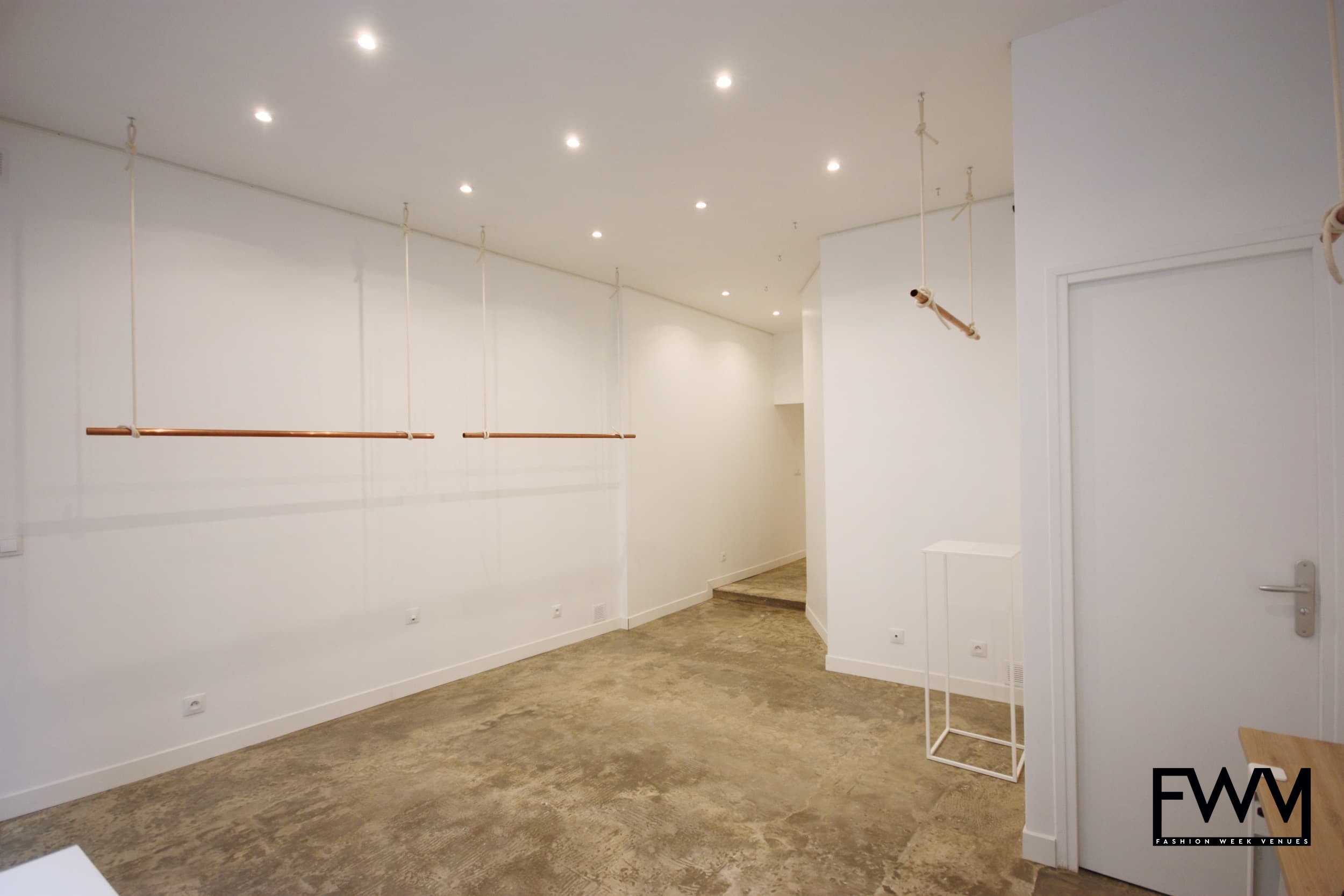 This modulable venue features a seamless design that allows for easy customization to fit your specific needs. It is equipped with adaptable hanging racks that can be hung up or removed at your convenience, making it easy to showcase your products or art pieces. The walls are adorned with picture rails, providing the perfect solution for displaying artwork or merchandise without any hassle. Additionally, the space includes a large mirror and essential furniture, allowing you to set up quickly and efficiently.