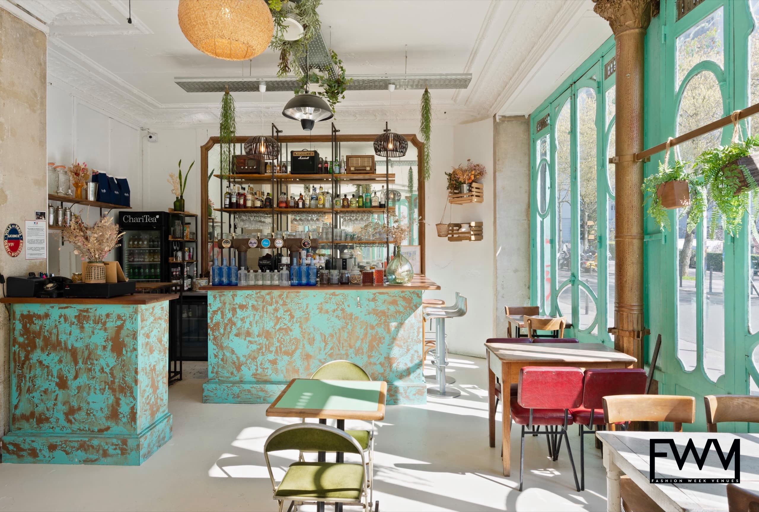 This charming restaurant reflects a remarkable Art Nouveau style, accentuated by its turquoise painted glass doors, elegant columns, and expansive mirrors. With a generous ceiling height, the atmosphere is airy and spacious, allowing natural light to flood in and create an inviting ambiance for guests. The unique blend of industrial decor and carefully curated vintage furnishings adds character and charm, making it an ideal backdrop for a variety of events.